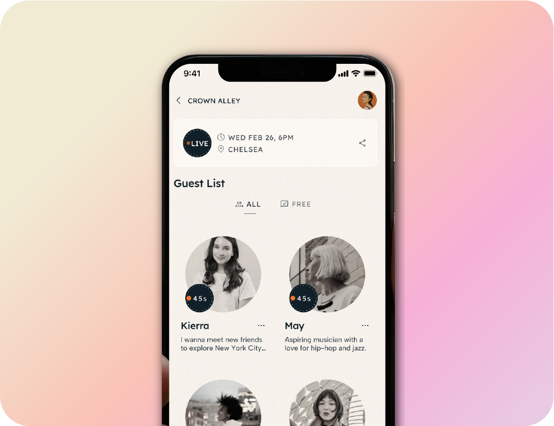 When a nudge gets accepted (the recipient clicks “accept”), Overture has done its job and it’s time to drop the phone. At larger venues, Overture gives users an optional three minutes to communicate about where to meet. (Otherwise, there is no texting on the app.) After these three minutes, texting times out.